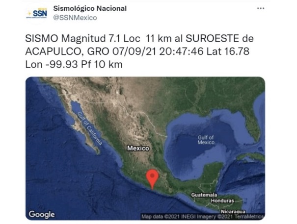 SISMO Magnitud 7.1 Loc 11 km al SUROESTE de ACAPULCO, GRO 07/09/21 20:47:46 Lat 16.78 Lon -99.93 Pf 10 km pic.twitter.com/nTHFlvKFZG