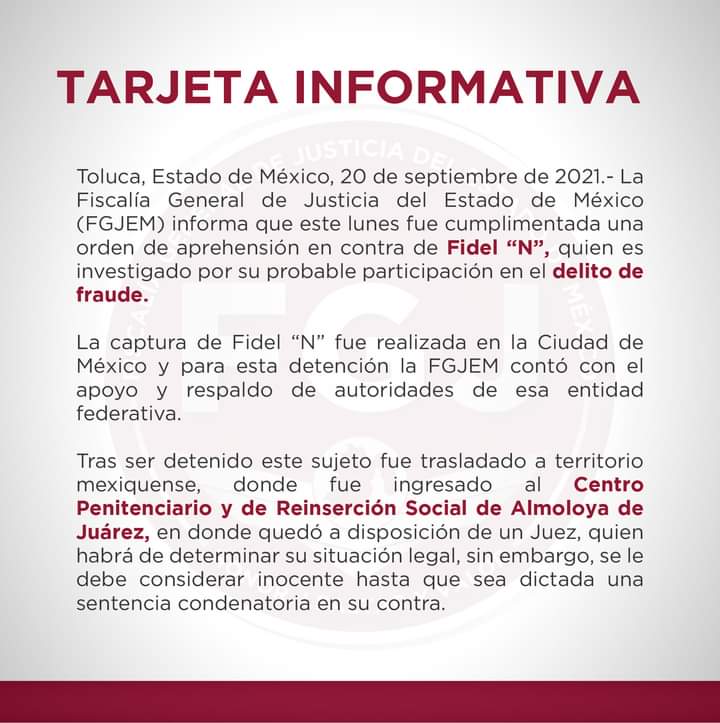 Toluca, Estado de México, 20 de septiembre de 2021.- La FIscalía General de Justicia del Estado de México (FGJEM) informa que este lunes fue cumplimentada una orden de aprehensión en contra de Fidel «N», quien es investigado por su probable participación en el delito de fraude.