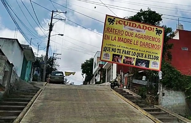 De entrada, han colgado lonas donde advierten que si capturan a un delincuente harán justicia por propia mano. Así se lee: “ratero que agarremos, en la madre le daremos; luego le hablamos a la policía, que no te pase lo que a ellos”.