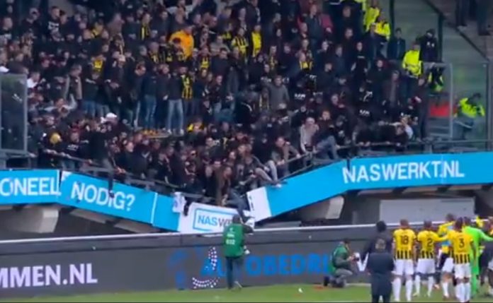 Una grada del estadio del NEC Nijmegen, de la primera división neerlandesa, se hundió este domingo cuando los aficionados del equipo contrario, el Vitesse, celebraban la victoria (0-1) en el derbi regional, en un incidente que se saldó sin heridos de gravedad.
