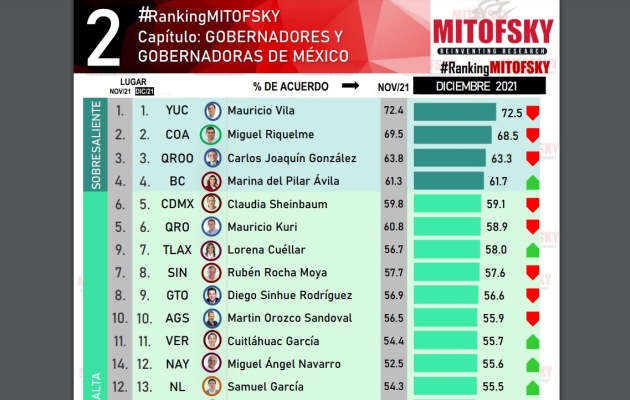 Es el panista, Mauricio Vila, gobernador de Yucatán, quien se mantiene en el primer lugar con el 72.5 por ciento de aprobación.