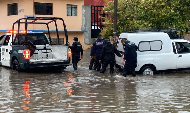 En la calle Leopoldo Kiel de la Colonia Rafael Lucio los efectivos estatales auxiliaron a unas personas que se quedaron varadas debido a las inundaciones provocadas por las intensas lluvias.