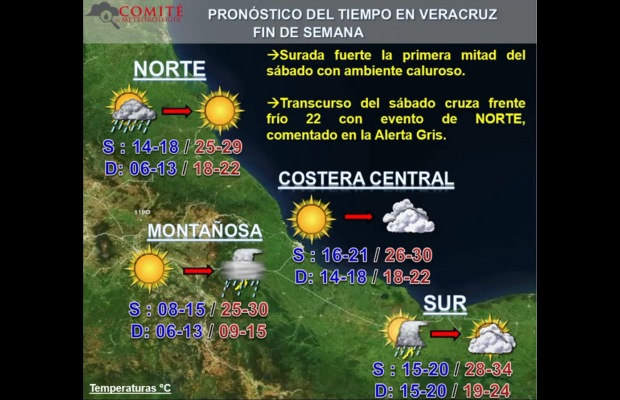 Xalapa, Ver.- Durante la sesión del Comité Estatal de Meteorología desarrollada esta mañana, se informó la emisión de una nueva Alerta Gris por la llegada del Frente Frío número 22 que provocará intensos vientos del Norte la tarde-noche de este sábado.