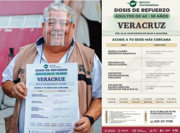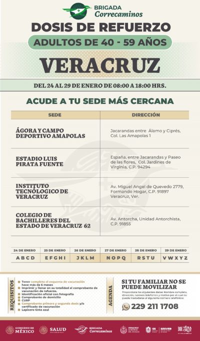 El funcionario explicó que los operativos para el refuerzo a los adultos de 40 a 59 años estarán en operación a partir del próximo lunes, y en un primer momento se diseminará de la siguiente manera: en Veracruz del 24 al 29; en Xalapa del 24 al 28; en San Andrés Tuxtla del 24 al 27, y en Orizaba del 24 al 27.