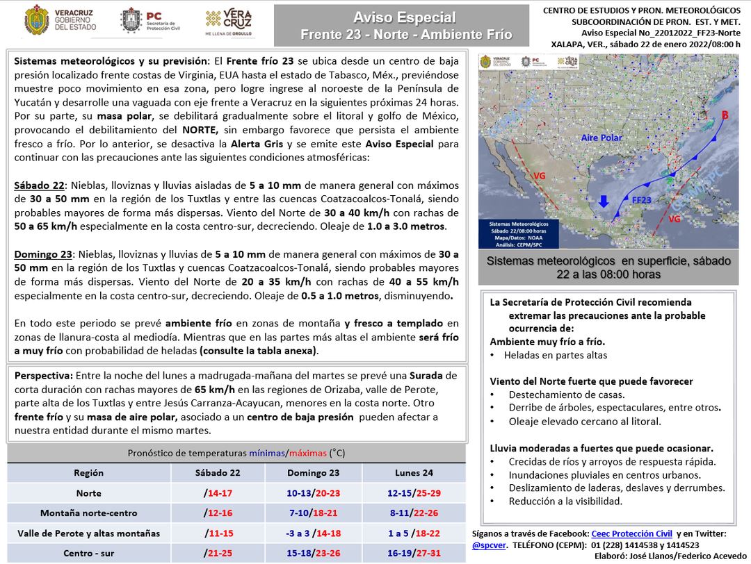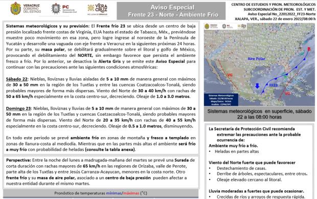 Xalapa, Ver.- La Secretaría de Protección Civil desactivó la Alerta Gris por el paso del Frente Frío número 23, sin embargo, informó que continuarán las bajas temperaturas y algunas lluvias en territorio veracruzano.