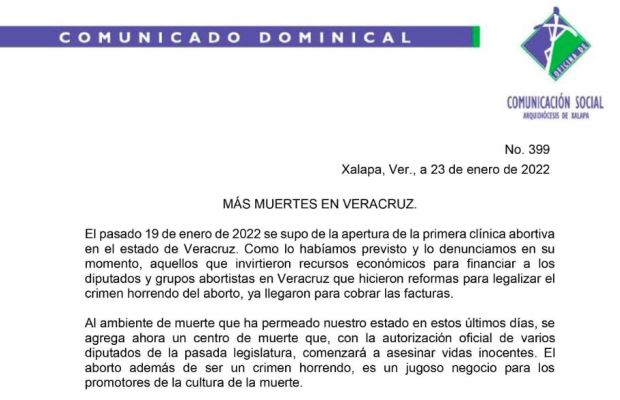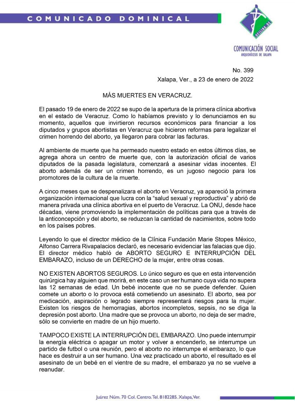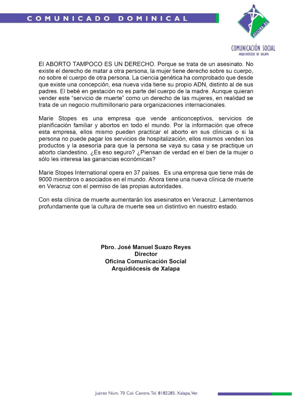 A través de un comunicado dominical, el vocero católico José Manuel Suazo Reyes, recordó que el pasado 19 de enero se supo de la apertura de la primera clínica abortiva en el estado de Veracruz.