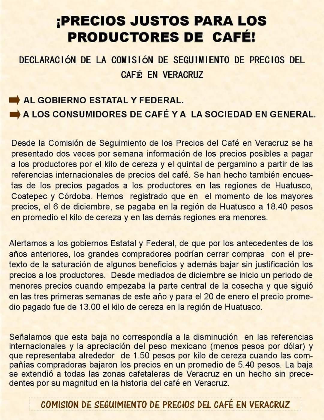 Recordaron que esta Comisión de Seguimiento a Precios de Café es representativa del sector, y desde el mes de octubre hace una presentación de los precios posibles a pagar a los productores; de café pergamino y cereza, con base a datos de la bolsa y encuestas efectuadas a las principales regiones.