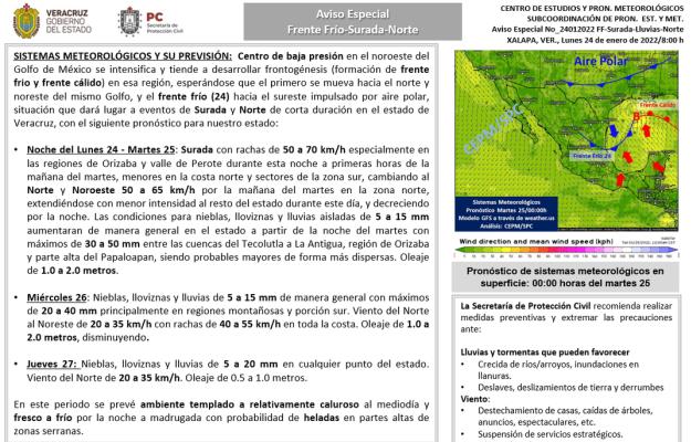 De acuerdo a la información vertida por el Centro de Estudios y Pronósticos Meteorológicos, un centro de baja presión en el noroeste del Golfo de México se intensifica y tiende a desarrollar frontogénesis (formación de frente frío y frente cálido) en esa región, esperándose que el primero se mueva hacia el norte y noreste del mismo Golfo, y el frente frío (24) hacia el sureste impulsado por aire polar, situación que dará lugar a eventos de Surada y Norte de corta duración en el estado de Veracruz, con el siguiente pronóstico para nuestro estado: