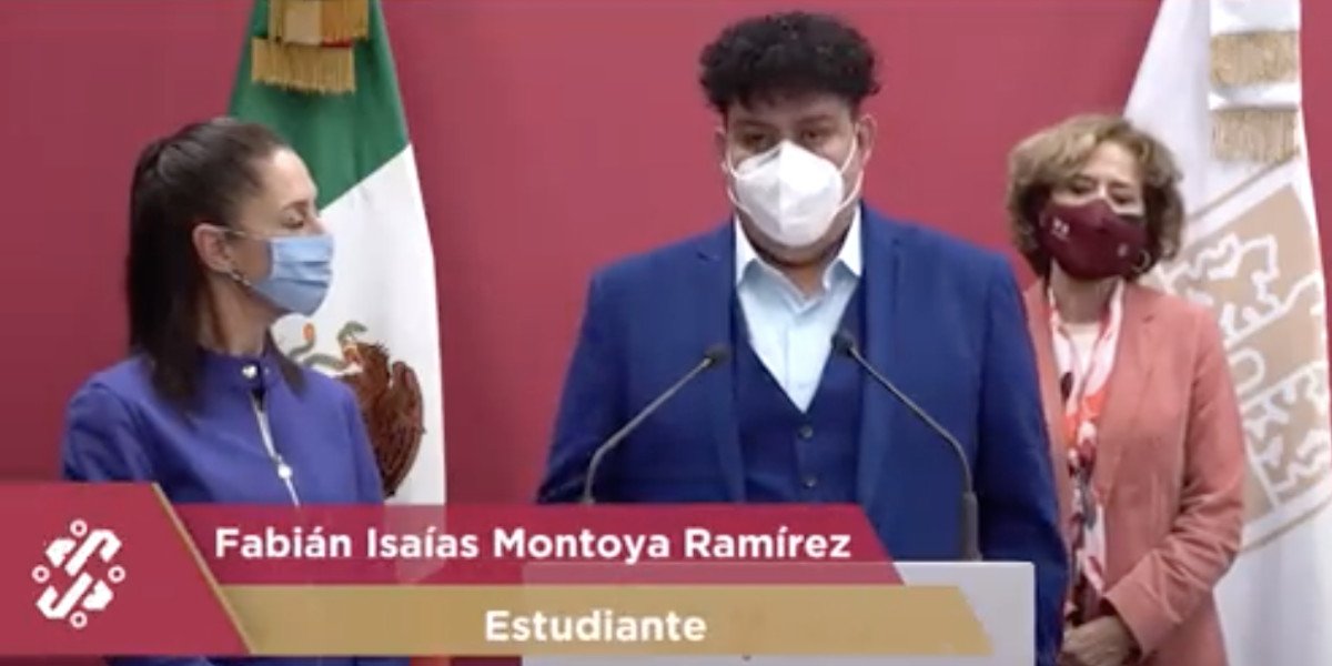 “Fabián Isaías Montoya Ramírez es el primer estudiante del Instituto de Estudios Superiores ´Rosario Castellanos´ en terminar la carrera y quisimos presentárselos el día de hoy, ha terminado ya todos sus créditos y está su madre aquí con nosotros, la señora María Teresa Ramírez de Montoya, que está muy orgullosa de su hijo y nosotros muy orgullosos de ustedes… ya me dijo que quiere llegar hasta el doctorado, así que lo vamos a apoyar”, dijo Sheinbaum.