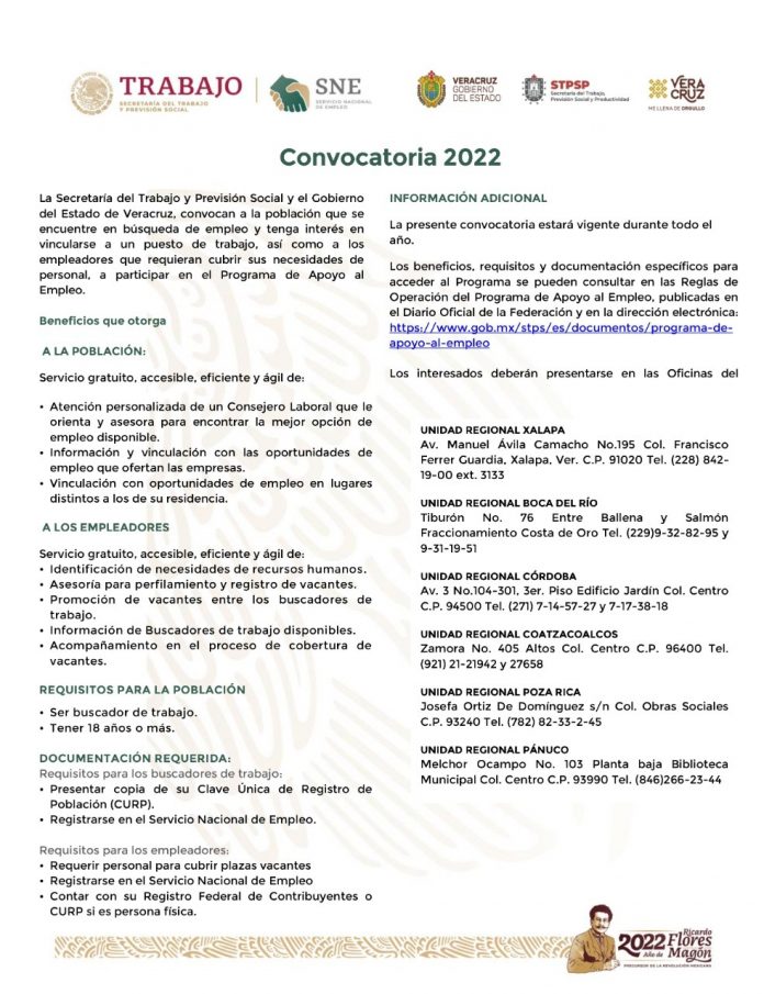 Para consultar las reglas de operación y formatos de solicitud está disponible el sitio www.gob.mx/stps/es/documentos/programa-de-apoyo-al-empleo; la dirección de las oficinas mencionadas se encuentra en www.veracruz.gob.mx/trabajo/unidadesregionalessne.