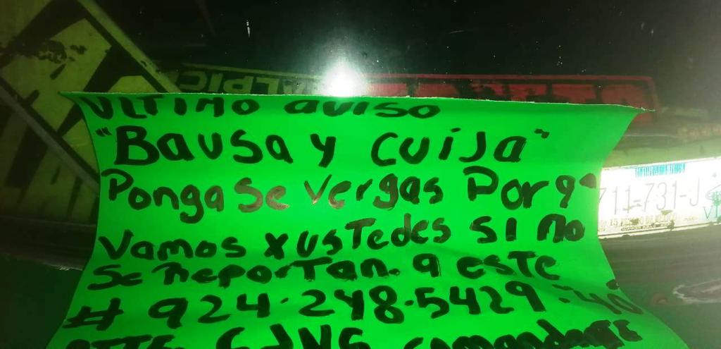 ** En el parabrisas del urbano dejaron una Narco Cartulina.