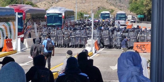 Agresión con tráiler. “Esta acción permitió liberar la caseta de peaje y los inconformes se alejaron del punto, momento en el que emplearon un tráiler sin conductor y lo lanzaron contra la línea de efectivos de la Guardia Nacional, quienes esquivaron la unidad de carga que se impactó contra una instalación metros adelante de la caseta de cobro”, agregó la dependencia.