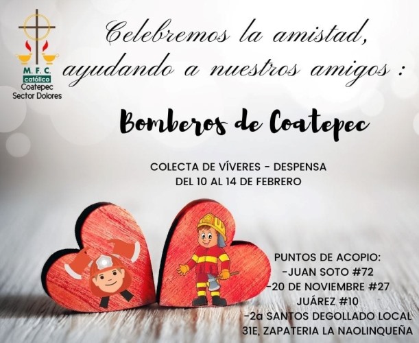 Coatepec, Ver. (YAEL HERRERA).- El Movimiento Familiar Cristiano (MFC) católico Coatepec sector Dolores, convocó a la población a sumarse a la colecta de víveres para entregar despensas al Cuerpo de Bomberos de Coatepec y la región el próximo 14 de febrero.