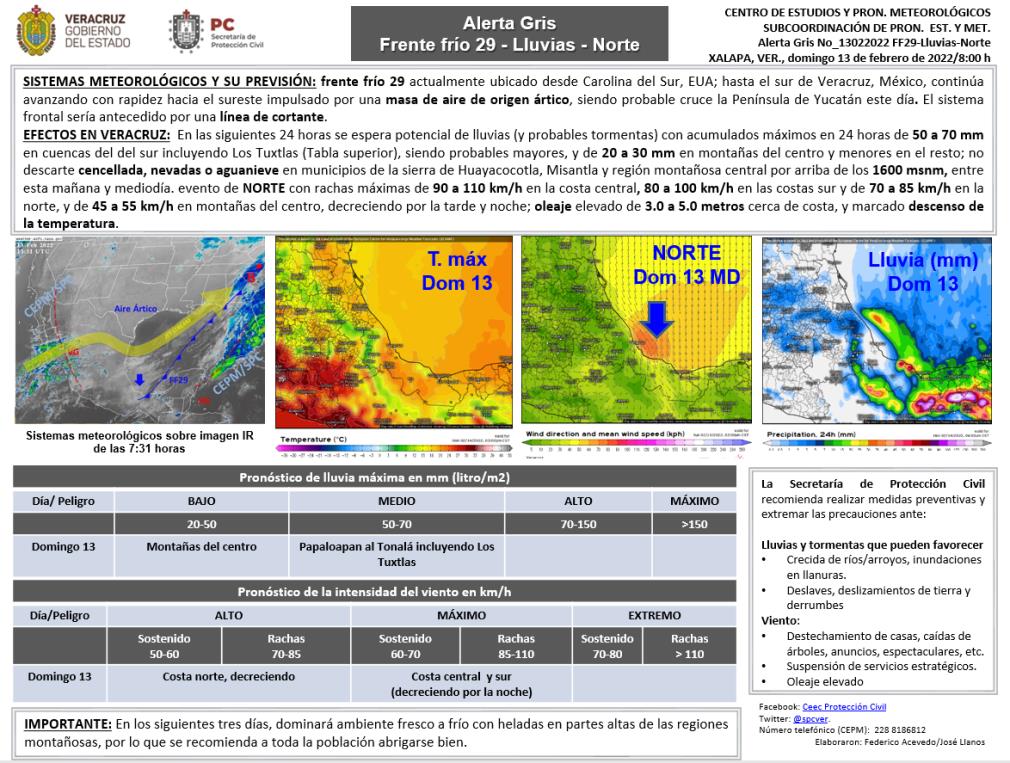El organismo, dependiente de la Secretaría de Protección Civil de Veracruz, ha informado sobre al paso del Frente Frío 29, reiterando que se mantiene la «ALERTA GRIS», estimando que las rachas del viento podrían alcanzar los 110 Km/h en la zona de costa, mientras que no se descarta cencellada, nevadas o aguanieve en municipios de la sierra de Huayacocotla, Misantla y región montañosa central por arriba de los 1600 msnm.