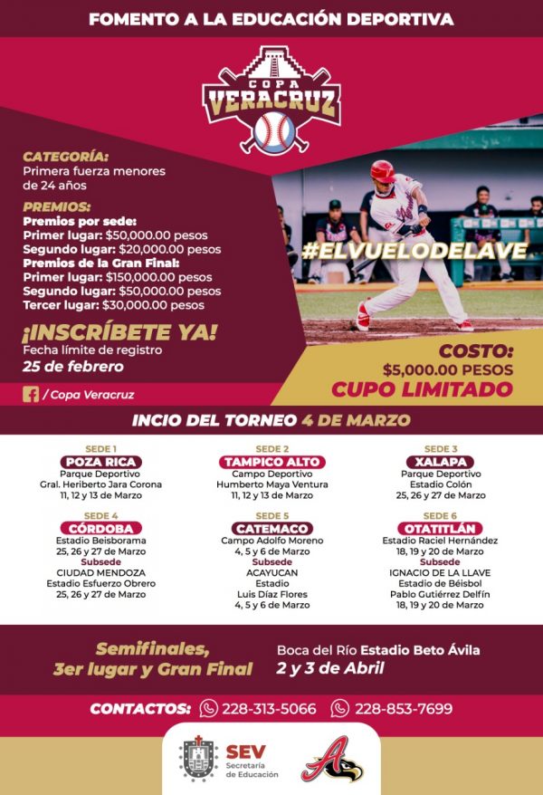 Xalapa, Ver., 15 de febrero de 2022.- La administración que encabeza el gobernador Cuitláhuac García Jiménez, a través de la Secretaría de Educación (SEV), convoca a jóvenes menores de 24 años –que participen en ligas locales– al primer torneo estatal de béisbol Copa Veracruz, del programa de Fomento a la Educación Deportiva.