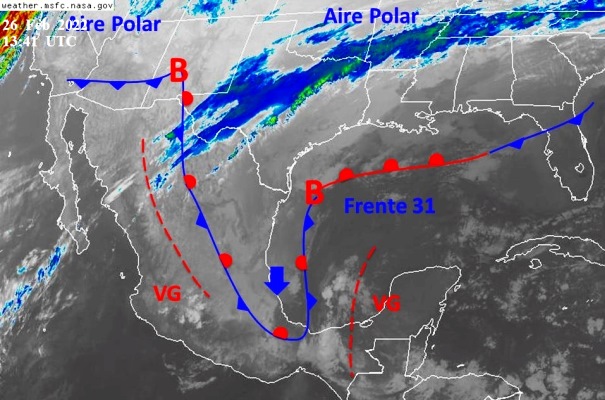 El FFrío31 actualmente ubicado desde un centro de baja presión en el Atlántico frente a Las Carolinas, Estados Unidos hasta otro centro de baja en el noroeste del Golfo de México, de donde parte como estacionario hasta el sur de Veracruz, sufrirá poco cambio hasta el día domingo 27 cuando su masa de aire polar debilitada, reciba más aportaciones de aire frío proveniente del oeste de los Estados Unidos.