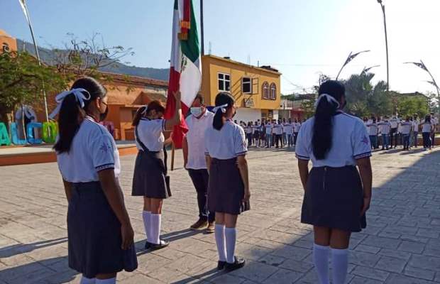 Jalcomulco, Ver.- El alcalde de Jalcomulco, David Meza Hernández conmemoró el Día de la Bandera en compañía de alumnos destacados del colegio de Bachilleres del Estado de Veracruz (Cobaev), evento que se llevó acabó a un costado de palacio municipal.