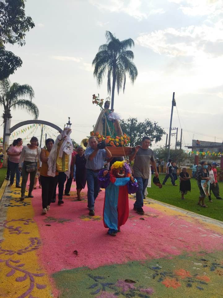 Como cada año antes de la pandemia, pobladores llevaron en hombros la imagen del santo patrono, seguidos del arco monumental y la danza de los tradicionales payasos y mojigangas, hacia el atrio de la iglesia.