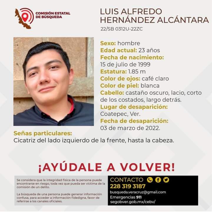 El joven Luis Alfredo de 23 años de edad, fue reportado como desaparecido desde el pasado 3 de marzo, cuando la Comisión Estatal de Búsqueda emitió la ficha respectiva.