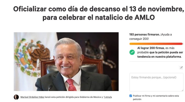 La petición que busca que el 13 de noviembre, día del cumpleaños de AMLO, sea de descanso oficial, hasta el momento cuentan con 193 de las 200 firmas que se piden.