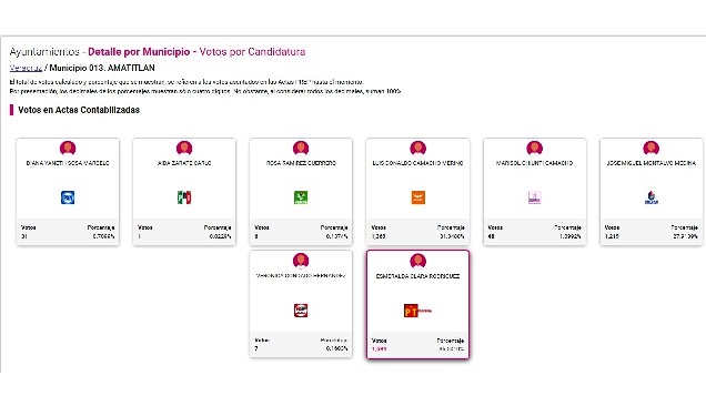 Amatitlán, triunfa Esmeralda Clara Rodríguez de la alianza Partido del Trabajo-Morena (PT-Morena) con 1594 votos, lo que equivale al 36.50 por ciento de la votación