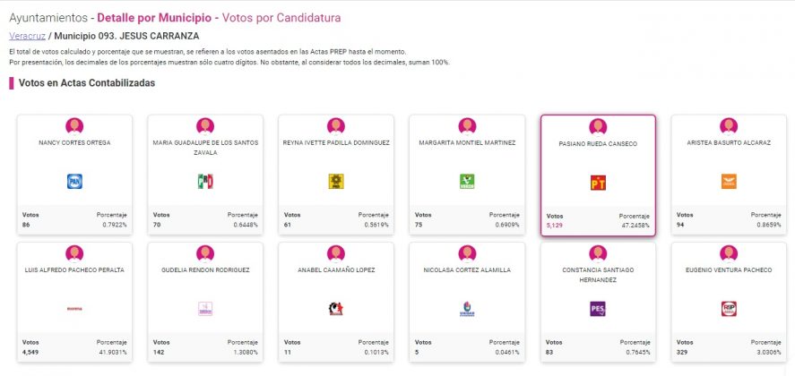 Jesús Carranza, triunfa Pasiano Rueda Canseco del Partido del Trabajo (PT) con 5129 votos, lo que equivale al 47.24 por ciento de la votación; destaca que este candidato actualmente se encuentra encarcelado.