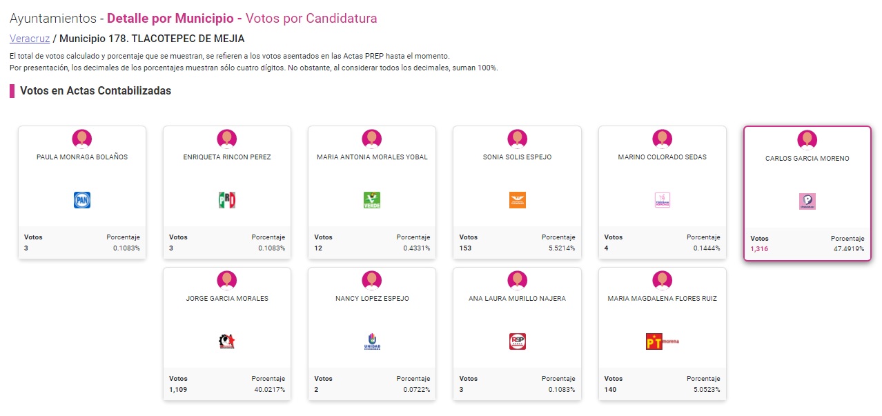 Xalapa, Ver.- Esta mañana el Programa de Resultados Preliminares (PREP) del Organismo Público Local Electoral de Veracruz (OPLE) logró la captura de 72 actas (el 100%) tras los comicios extraordinarios en los municipios de Amatitlán, Chiconamel, Jesús Carranza y Tlacotepec de Mejía.