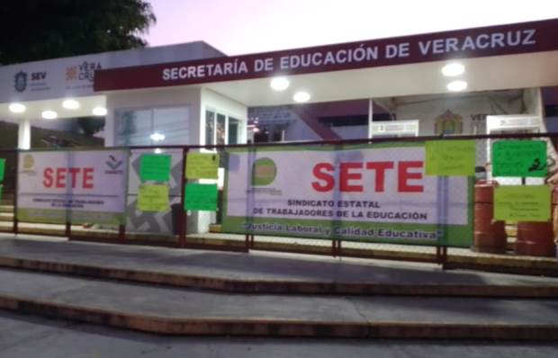 Xalapa, Ver.- Maestros agremiados al Sindicato Estatal de Trabajadores de la Educación (SETE) se plantaron esta madrugada frente a instalaciones de la Secretaría de Educación de Veracruz; los docentes han bloqueado todas las entradas, colocando lonas; piden el retorno de las Escuelas de tiempo completo así como mejoras salariales.
