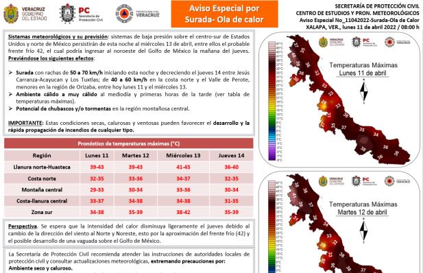 Surada con rachas de 50 a 70 km/h iniciando esta noche y decreciendo el jueves 14 entre Jesús Carranza-Acayucan y Los Tuxtlas; de 40 a 60 km/h en la costa norte y el Valle de Perote, menores en la región de Orizaba, entre hoy lunes 11 y el miércoles 13.