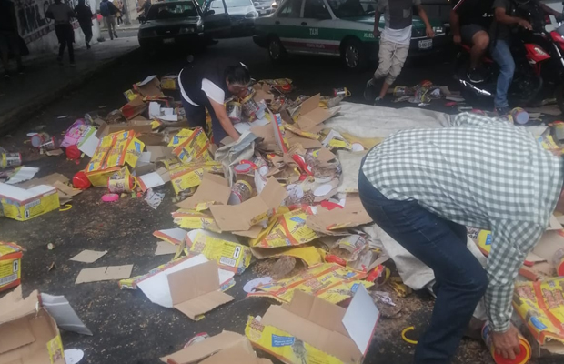 Xalapa, Ver.- La mañana de este martes un carro que circulaba sobre el puente Miguel Alemán dejó tirada su mercancía, esto en la avenida Lázaro Cárdenas.