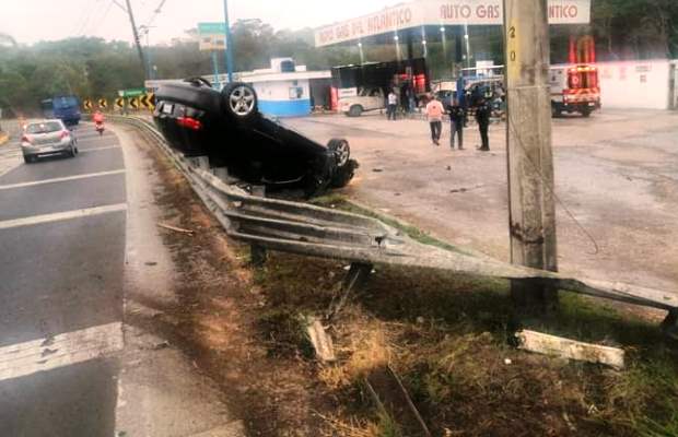 Un auto terminó con la llantas hacia arriba, montado sobre la valla de acero lateral, justo frente a la planta de gas «Atlántico», en el carril que proviene de la capital del Estado alrededor de las cinco de la tarde.