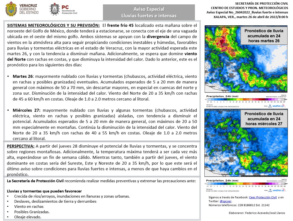 SISTEMAS METEOROLÓGICOS Y SU PREVISIÓN:  El frente frío 45 localizado esta mañana desde el Lago Hurón hasta la frontera norte de México, avanza hacia el sureste, previéndose ingrese al noroeste del Golfo de México de esta noche a mañana, donde tenderá a estacionarse. Sin embargo, estará induciendo el desarrollo de una vaguada con eje sobre el oeste del mismo Golfo. Ambos sistemas estarán apoyándose con un flujo zonal y difluente en la atmósfera alta para dar lugar a condiciones inestables y húmedas a partir de esta tarde y noche y hasta el miércoles, favorable para lluvias y tormentas eléctricas en el estado de Veracruz, con la mayor actividad durante el martes 26. Dado lo anterior, el pronóstico para los siguientes tres días es: