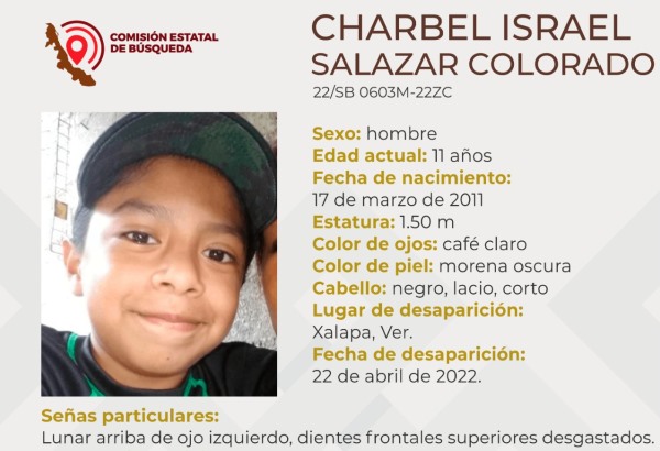 Se trata de Charbel Israel Salazar Colorado quien tiene como seña particular un lunar arriba del ojo izquierdo, mide 1.50 metros de estatura, es de piel morena oscura, ojos color café claro y con pelo color negro, lacio y corto.