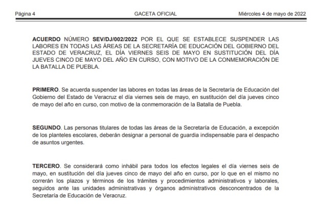 La disposición, misma que ya fue publicada en la Gaceta Oficial del gobierno del estado, se acuerda suspender las labores en todas las áreas de la SEV el día viernes 6 de mayo, en sustitución del día jueves 5 de mayo del año en curso, esto con motivo de la conmemoración de la Batalla de Puebla.