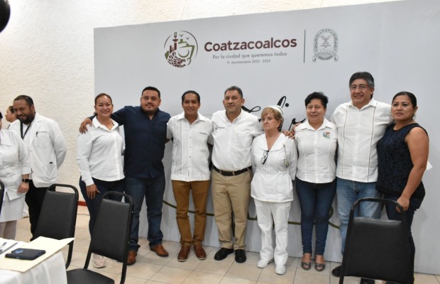 Enfermero José Luis Enríquez Guzmán, representante sindical ISSSTE; Juan Reveles Wong, representante sindical de la Clínica 36; doctora Esperanza de la Rosa Valencia, Directora de la Clínica Hospital del ISSSTE Coatzacoalcos; licenciada Marisela Hernández Morales, Jefa de Enfermeras del IMSS 36.