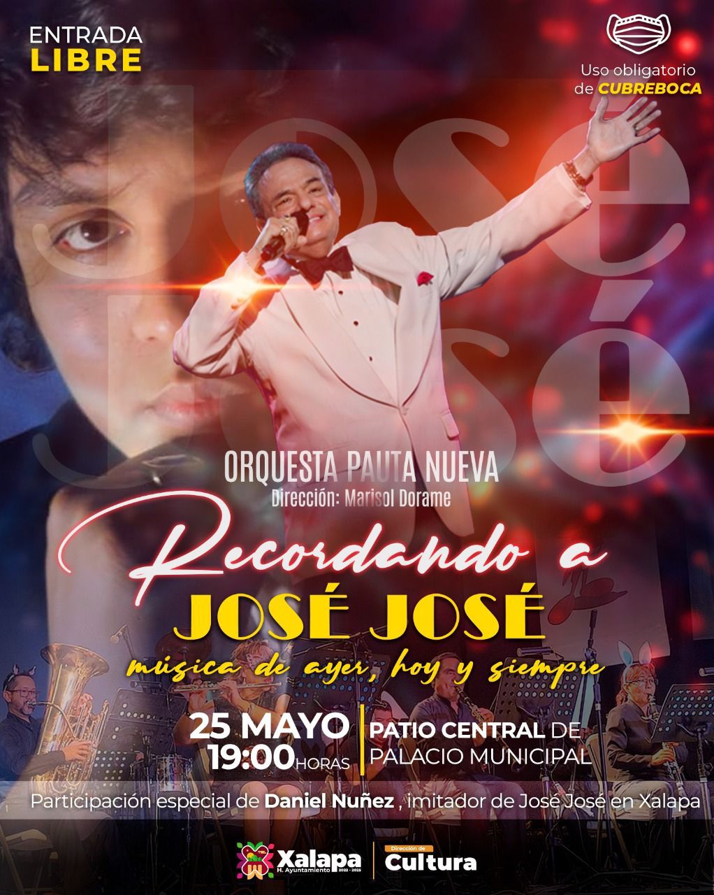 Xalapa, Ver.- Con el propósito de promover la convivencia familiar y el acceso a la cultura de todos los sectores de la población, el próximo miércoles 25 de mayo a las 19:00 horas, en el patio central de Palacio Municipal, la Orquesta Pauta Nueva ofrecerá el concierto: “Recordando a José José, música de ayer, hoy y siempre”.