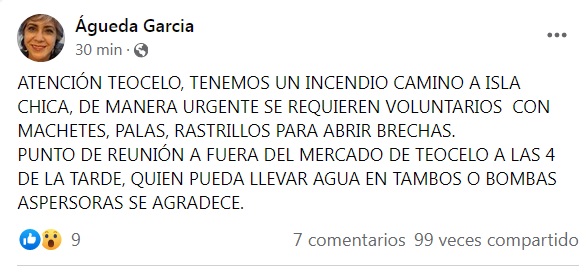 «Hay un incendio en Isla Chica, ya se le pidió el auxilio a Bomberos de Coatepec y otras personas que nos están ayudando ya se trasladaron al lugar, por ahora nos comentan que ya se está bajando la intensidad del incendio«, dijo la síndica