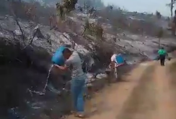 Con cubetas y aspersoras, pobladores participaron en el combate de las llamas.