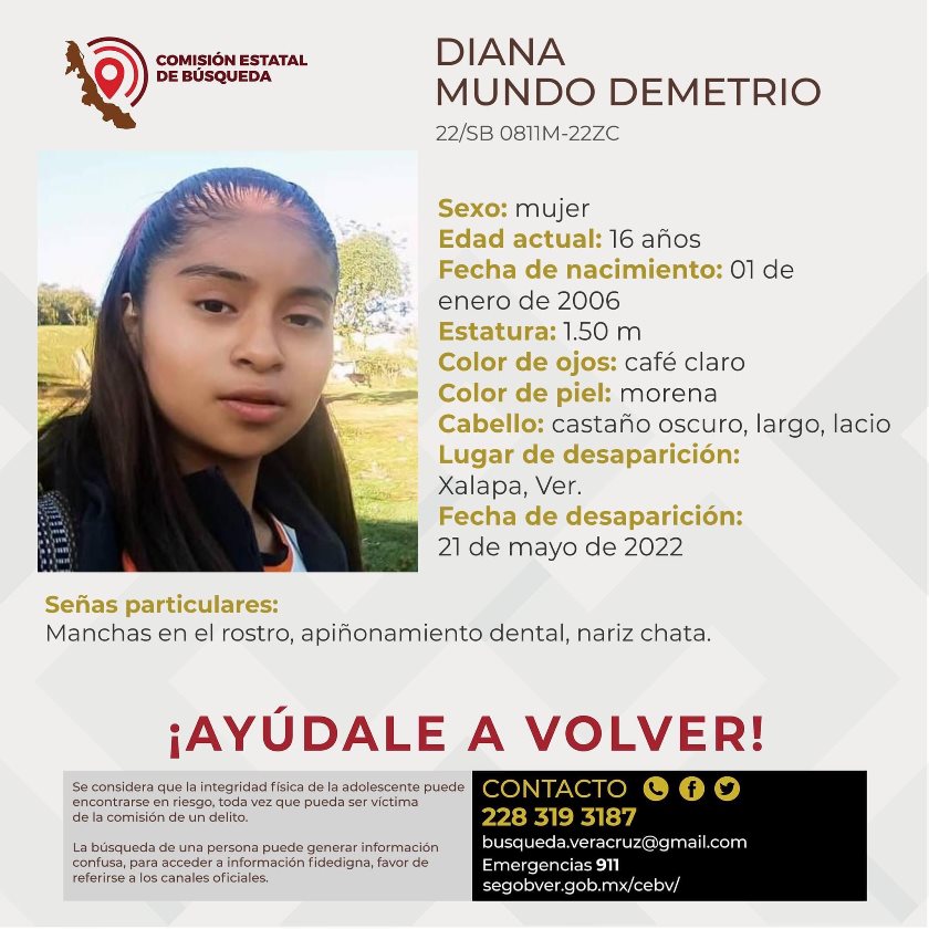 Otra jovencita, quien responde al nombre de Diana Mundo Demetrio, de 16 años, mide 1.60 metros de estatura, con ojos color café claro, piel morena, cabello castaño oscuro largo y lacio, como seña particular presenta manchas en su rostro y nariz chata; fue vista por última ocasión el pasado 21 de mayo en la ciudad de Xalapa.