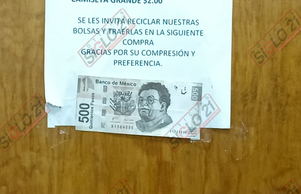 Con el espécimen pegado a una hoja, un comerciante establecido en la cabecera municipal, muestra a sus clientes el billete falso para que comprendan porqué ahora se hace una revisión a los billetes de 500 y de mil pesos cuando pagan la mercancía que adquieren.