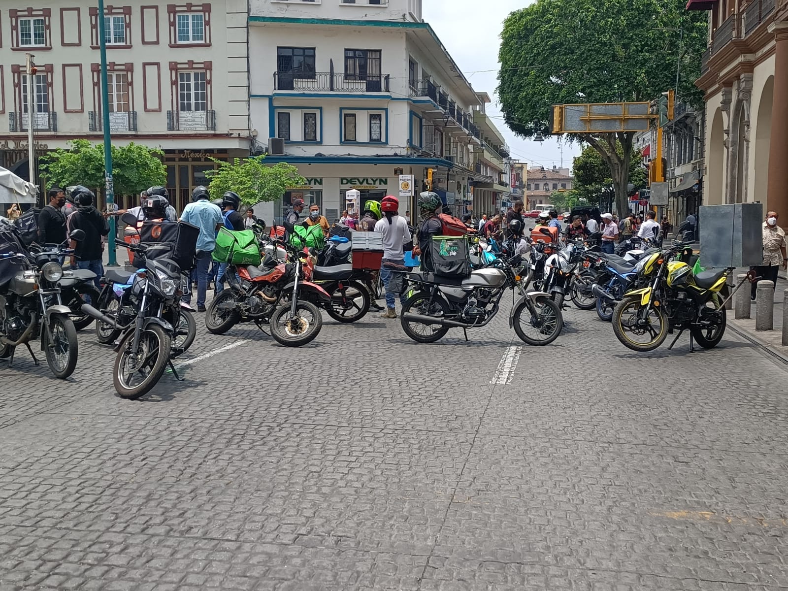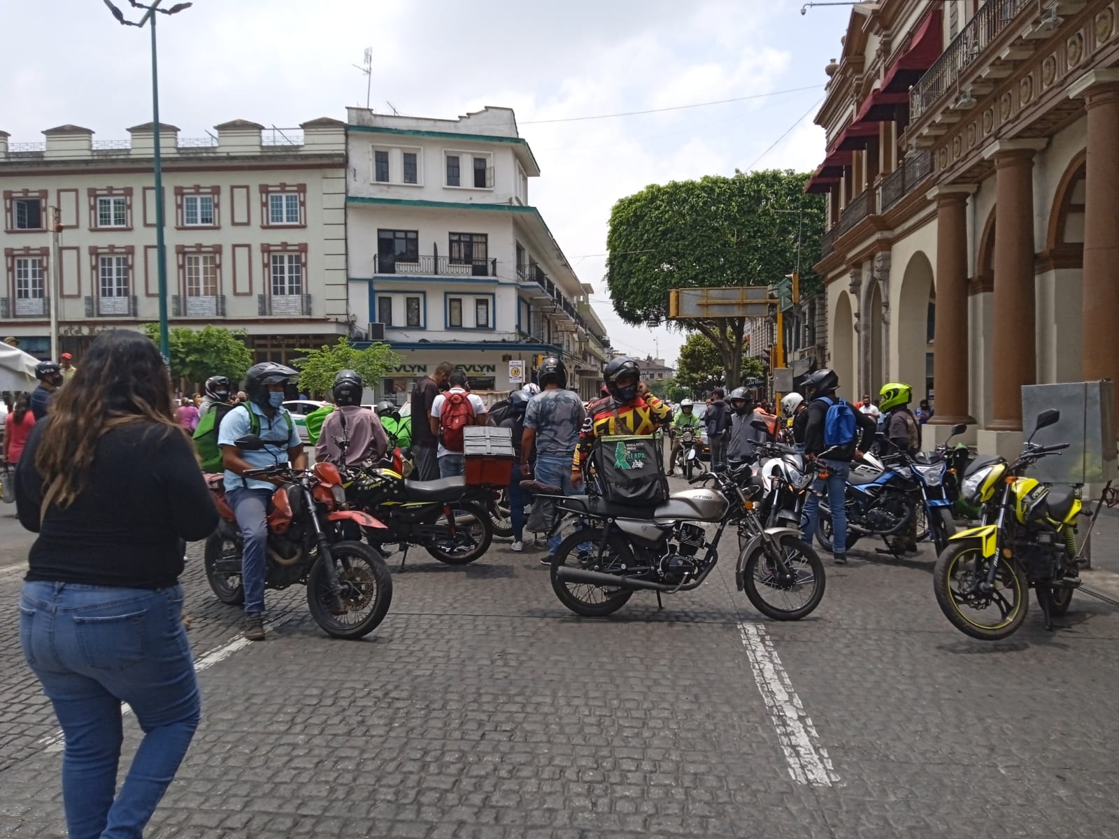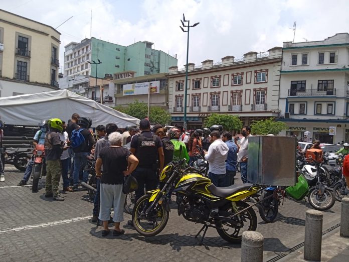 Xalapa, Ver. (Ana Lilia Velázquez).- Motorepartidores de Xalapa cerraron la calle Enríquez en el centro histórico de la capital, para exigir cese el acoso de policías estatales sin motivo alguno.