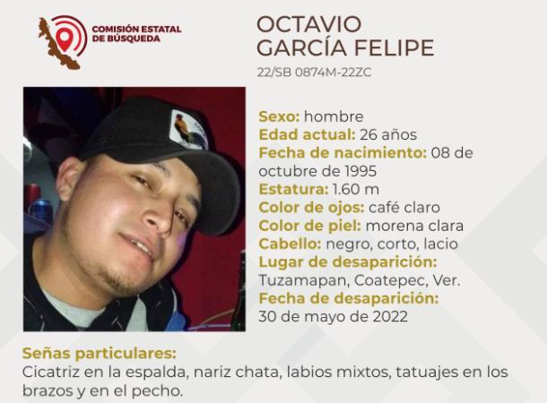 Octavio García Felipe, quien tiene cumplidos 26 años, mide 1.60 metros de estatura, de piel morena clara y como señas particulares tiene una cicatriz en la espalda, nariz chata, labios mixtos además de tatuajes en los brazos y en el pecho.