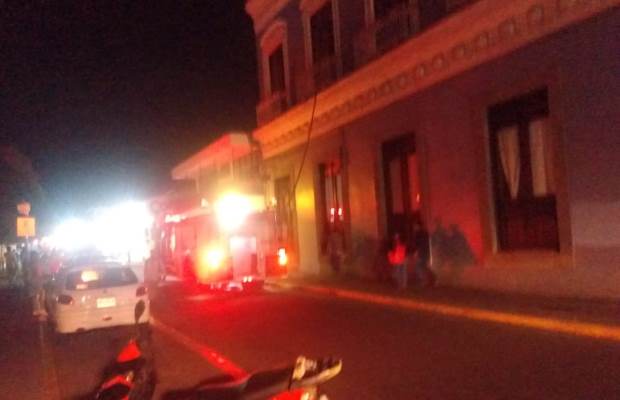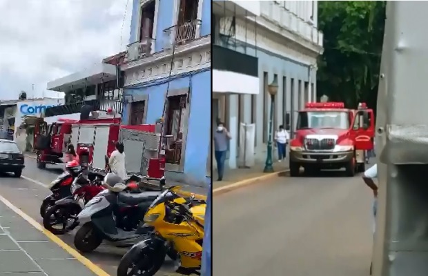 Fue minutos antes de las tres de la tarde que la Motobomba 01, llegó con la sirena apagada con varios Bomberos a bordo hasta un costado del Palacio Municipal por lo que fue cerrado el paso vehicular por la calle Lerdo desde su cruce con Melchor Ocampo.