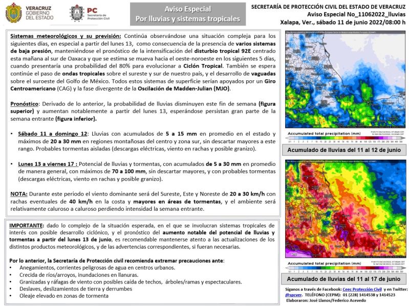 IMPORTANTE: dado lo complejo de la situación esperada, en el que se involucran sistemas tropicales de interés con posible desarrollo ciclónico, y el pronóstico del aumento notable del potencial de lluvias y tormentas a partir del lunes 13 de junio, es recomendable mantenerse atento a las actualizaciones de los distintos productos meteorológicos, y de las advertencias correspondientes, si fueran necesarias.
