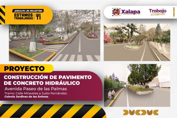 Xalapa, Ver.- Por los trabajos de pavimentación con concreto hidráulico que se realizan en la avenida Paseo de las Palmas, a partir del lunes habrá adecuaciones viales en la zona, con el fin de permitir un adecuado avance de la obra y afectar lo menos posible el flujo vehicular, por lo que se solicita a la población su comprensión, que programe sus recorridos y evite transitar por esta área sino es necesario.