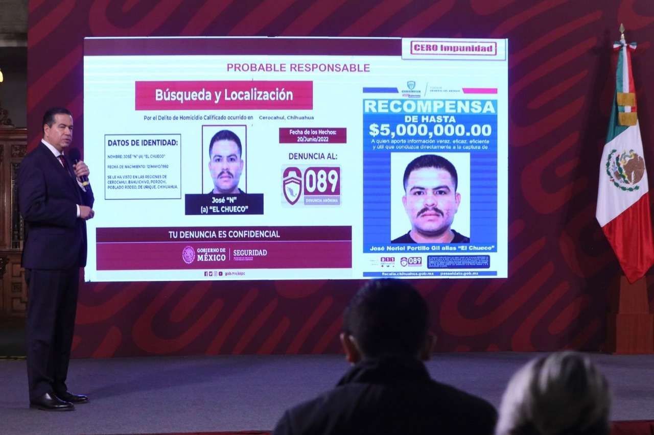 Añadió que la Fiscalía General de Chihuahua ofreció una recompensa de 5 millones de pesos a quien aporte información veraz para la captura de José «N», alias «El Chueco», de 30 años de edad.