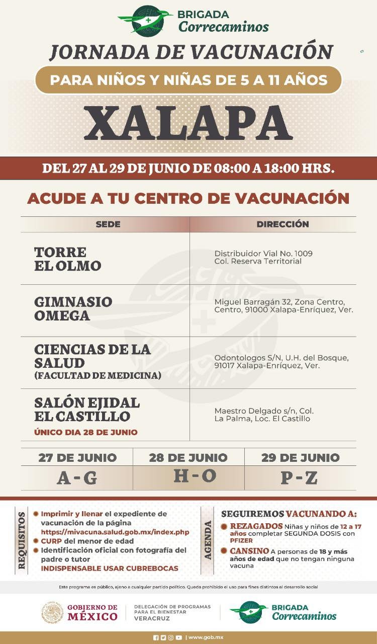 En Xalapa la jornada se llevará a cabo el 27 de junio para los apellidos de la A a la G, el 28 para los apellidos de la H a la O y el 29 de junio de la P a la Z, en un horario de las 8:00 a las 18:00 horas en las sedes: Torre El Olmo, Gimnasio Omega, Ciencias de la Salud (Facultad de Medicina) y Salón Ejidal El Castillo (28 de junio único día).