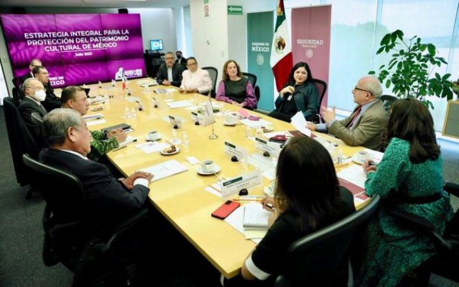 Ciudad de México.- Hoy se llevó a cabo una reunión de seguimiento y actualización de las acciones para la protección del patrimonio cultural del país, encuentro encabezado por la presidenta honoraria del Consejo Asesor de Memoria Histórica y Cultural de México, Beatriz Gutiérrez Müller, esposa del presidente Andrés Manuel López Obrador; el Fiscal Alejandro Gertz, y las secretarias de Seguridad y Protección Ciudadana, Rosa Icela Rodríguez, y de Cultura, Alejandra Frausto.