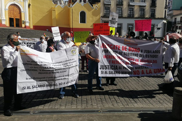 Xalapa, Ver. (Enrique Yasser Pompeyo).- Este miércoles jubilados y pensionados del SNTE, ISSSTE, asociaciones civiles y otras dependencias se manifestaron en Palacio de Gobierno para exigir el pago del bono a jubilados, incremento de días de aguinaldo, mejora en los servicios de seguridad social y pago de seguro a los familiares.