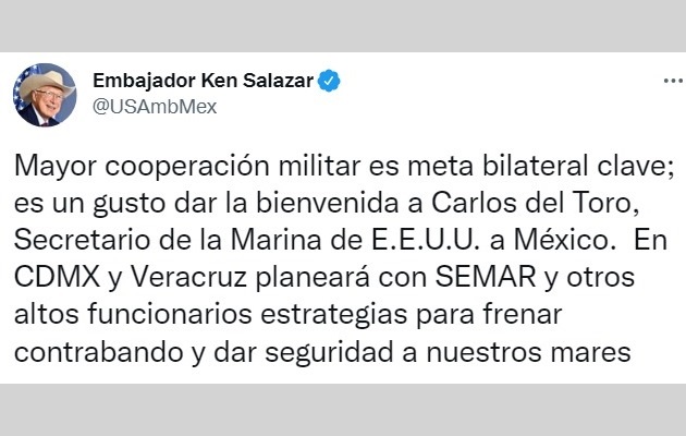 Stronger military cooperation is a key bilateral goal so I’m pleased to welcome @SECNAV Carlos del Toro to Mexico. He’ll strategize in CDMX and Veracruz with SEMAR and other senior Mexican officials how to stem illicit trade and secure our waters. https://t.co/iaKIsB4PIJ